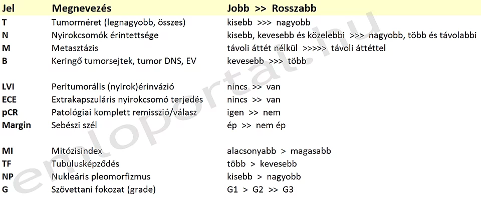 Az alábbi táblázatban megtalálhatók a betegség kimenetelét leginkább befolyásoló tényezők. A nyilak száma a hatáskülönbséget érzékelteti. Az összefüggések statisztikai alapúak és csak tájékoztató jellegűek. Egyedi esetekben bizonyos irányok felcserélődhetnek, illetve változhat a fontosságuk a betegség kezelését és/vagy prognózisát illetően. Új, hatékonyabb, személyre szabott kezelési módok hatására a lista módosulhat.
